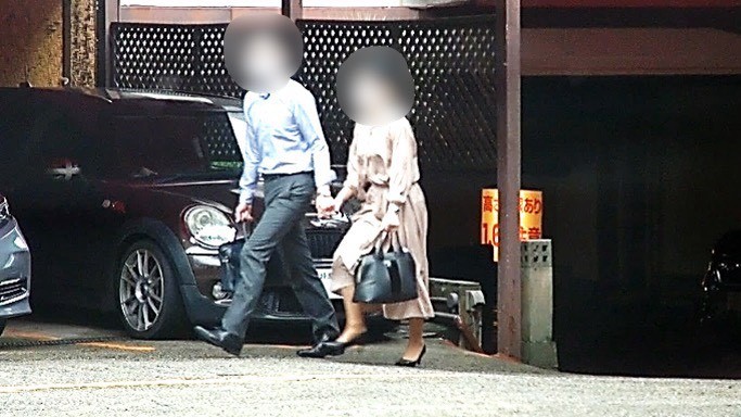ホテル出口から出てくる対象者と女性。※9時間以上滞在